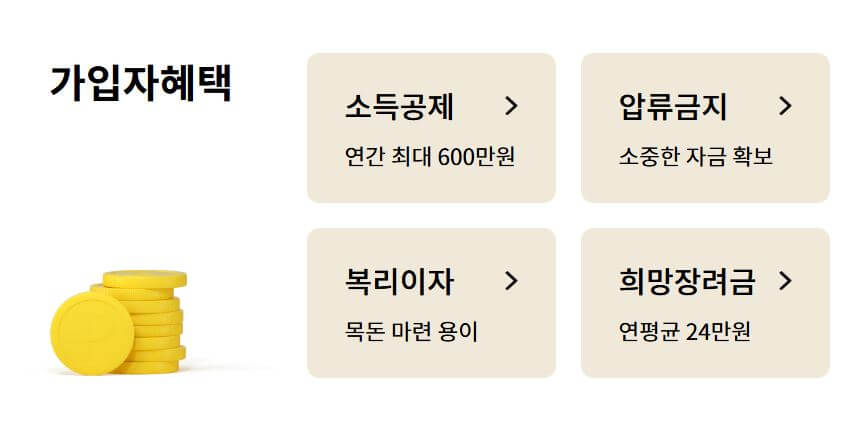 소득공제, 복리이자, 압류 방지 등 다양한 장점이 있으며, 희망장려금과 결합하면 더욱 큰 재정적 안정성을 제공합니다.