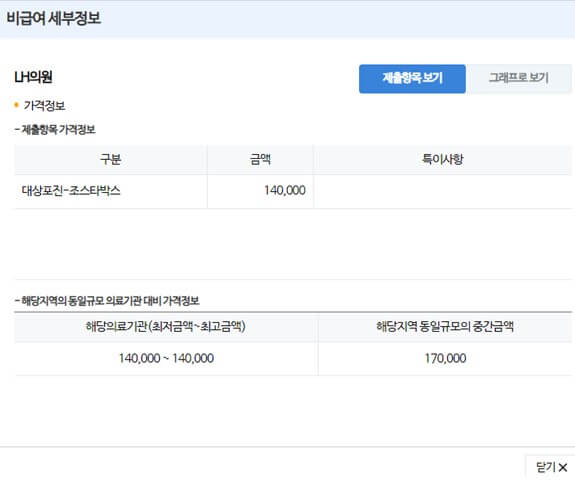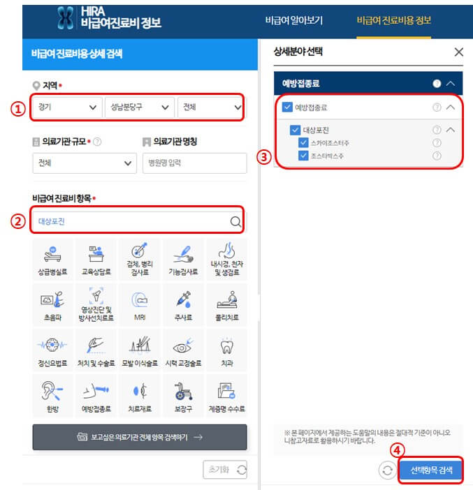 3. 찾아보고 싶은 지역을 선택하고, 비급여 진료비 항목에 "대상포진"을 입력합니다.