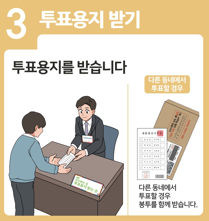 3. 투표용지 수령: 관내선거인은 투표용지를, 관외선거인은 투표용지와 회송용 봉투를 받습니다.