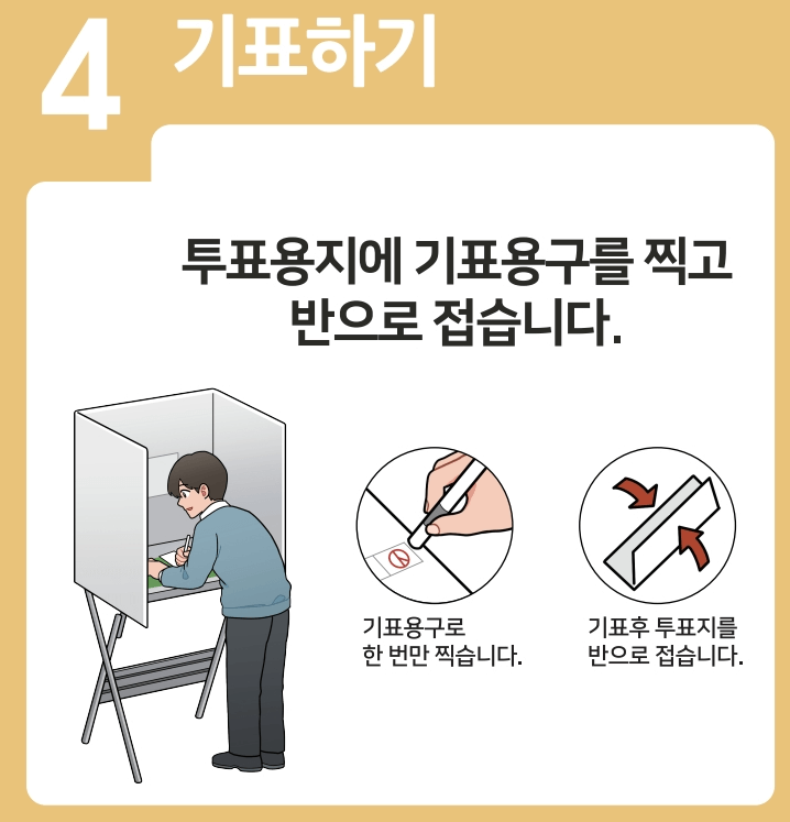 5. 투표용지는 반드시 기표용구를 사용하여 정확히 기표해야 합니다. 딱 한 번만 네모칸 안에 찍어야 하며, 연필이나 펜 등 다른 도구를 사용하거나 여러 번 찍으면 무료 처리됩니다.