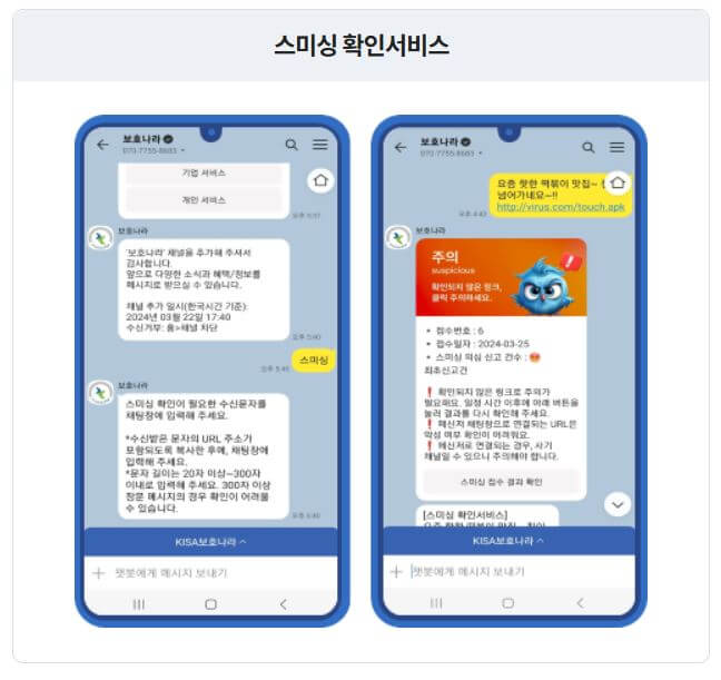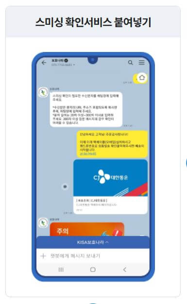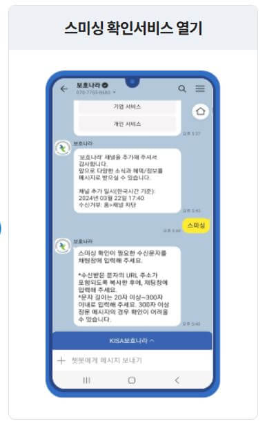 보호나라는 카카오톡 채널을 통해 스미싱 확인 서비스를 제공합니다. 사용자는 간단히 보호나라 카카오톡 채널을 추가하고, 의심스러운 메시지를 전송하여 스미싱 여부를 확인할 수 있습니다.