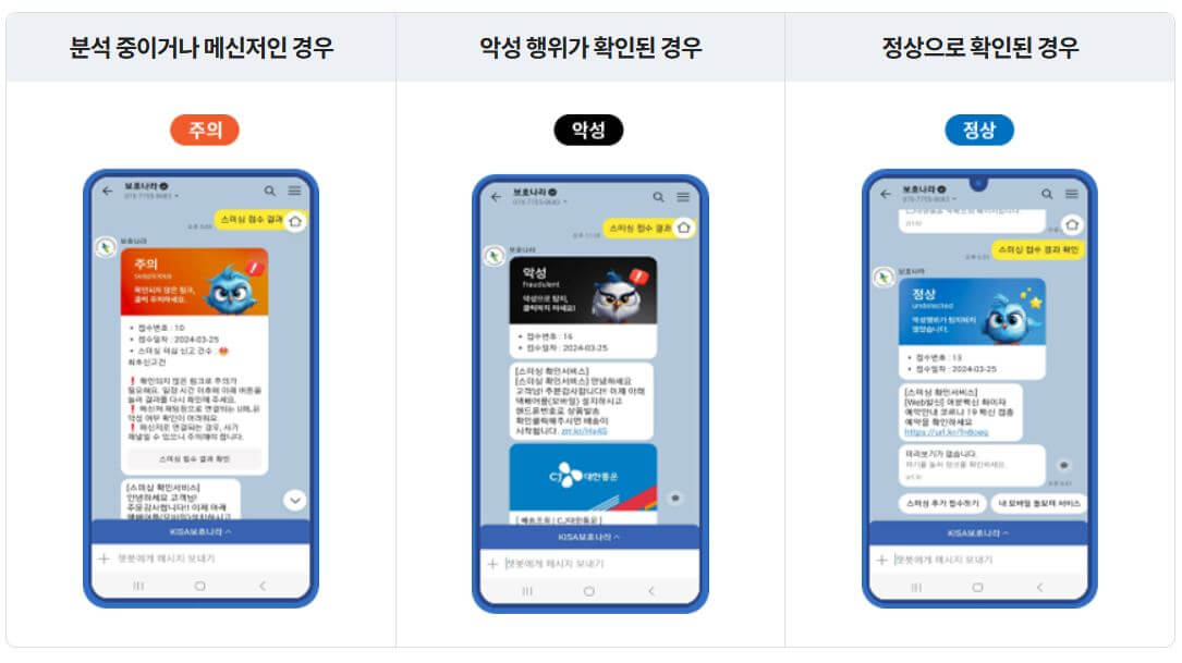 6. 보호나라에서 메시지를 분석하여 '정상', '주의', '악성' 중 하나로 결과를 제공합니다.