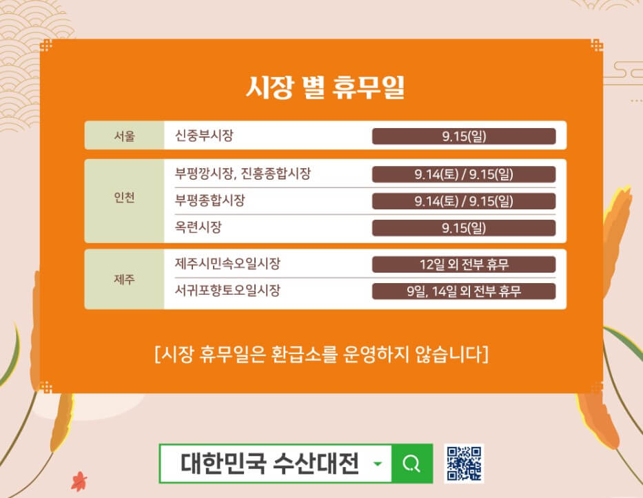 해양수산부와 한국수산회가 함께 주최하여 국산 수산물 소비 촉진과 전총시장 활성화를 목표로, 추석을 앞둔 9월 11일부터 추석 연휴직전까지 진행됩니다.