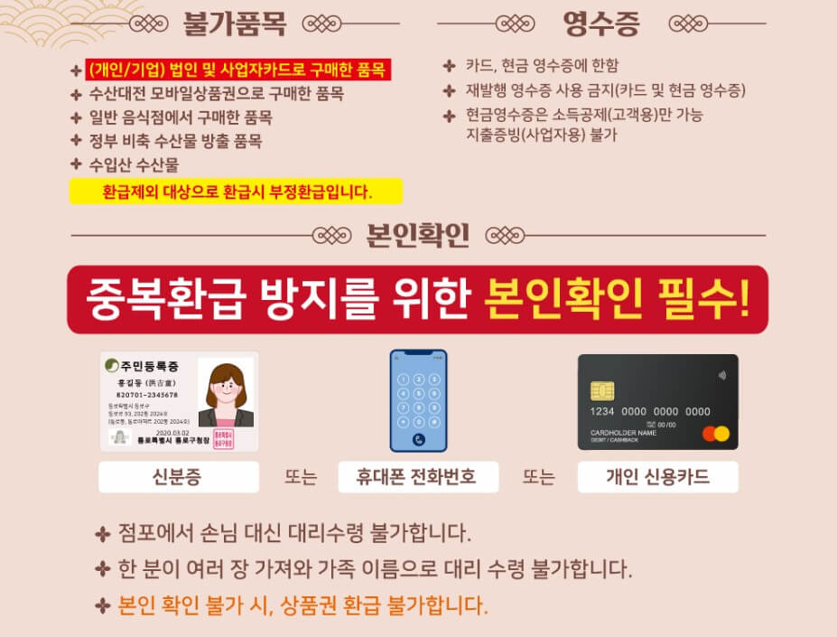| 환급 제외 항목 | 1. 법인 및 사업자카드로 구매한 경우 2. 제로페이 모바일 상품권으로 구매한 경우 3. 일반 식당에서 구매한 경우 4. 정부 비축 수산물 5. 수입 수산물 |