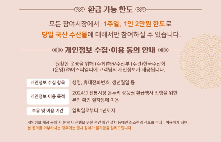 | 참여 절차 | 1. 참여 매장에서 국내산 수산물 구매 2. 당일 구매 영수증 지참하여 환급 행사 장서 방문 3. 개인정보 동의 절차 진행 4. 확인 뒤 온누리상품권으로 환급 |