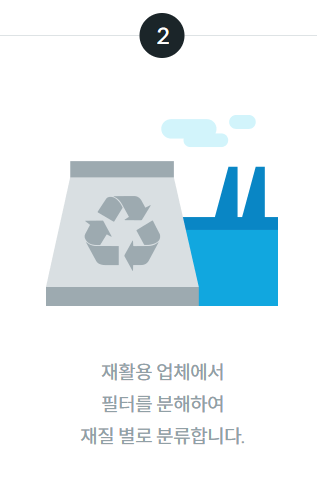 - 수거된 필터는 재활용 업체로 보내져 플라스틱과 금속으로 분리 후 재활용.