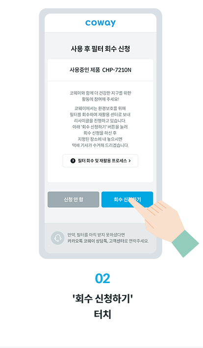 코웨이는 필터 회수 서비스를 통해 사용된 필터를 재활용하고 있습니다. 다음은 코웨이 필터 처리 절차입니다.