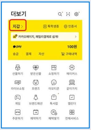 - 지갑 메뉴: '더보기' 화면에서 노란색 박스 영역이 나타나면, 그 안의 상단에 위치한 ‘지갑 >’ 메뉴를 클릭합니다.