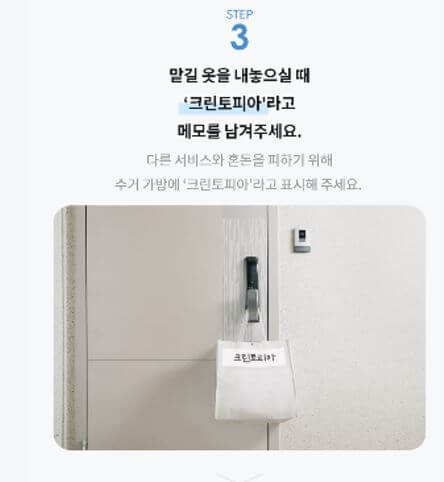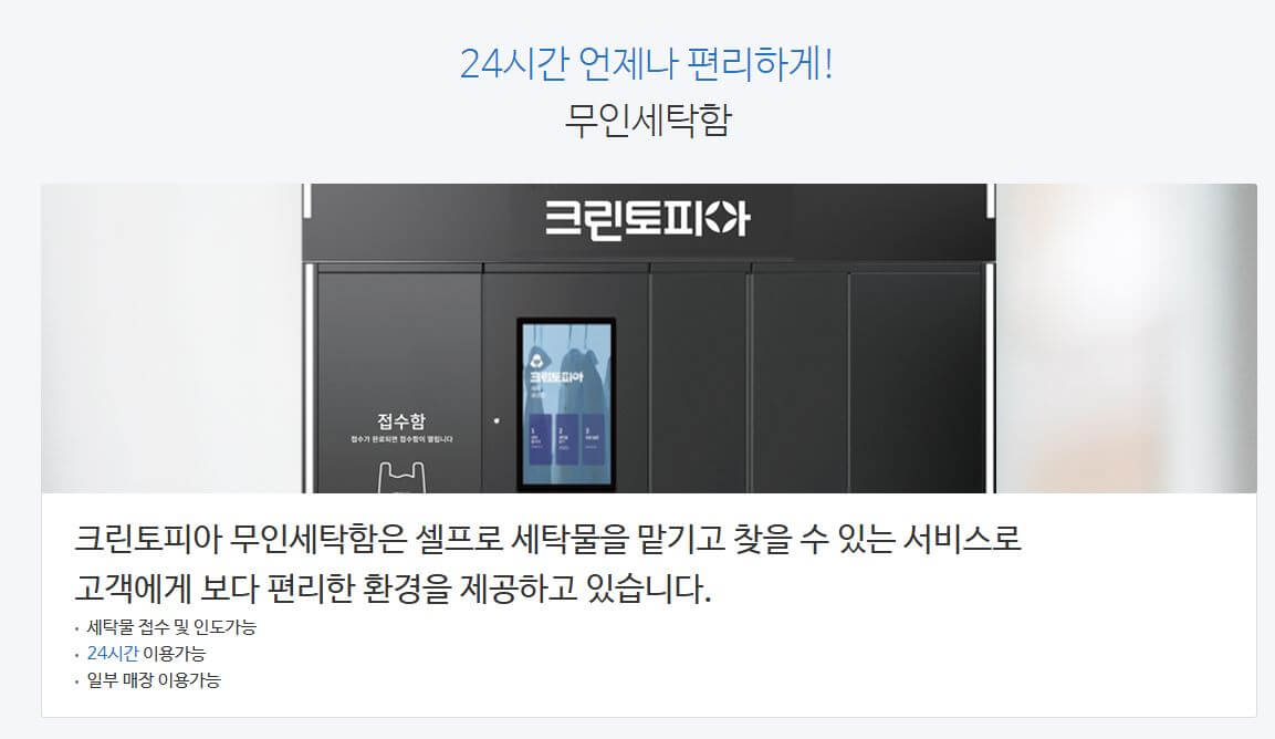 일부 지역에서는 '무인 수거함 서비스'를 운영하고 있습니다. 아파트 단지나 오피스 빌딩에 설치된 무인 수거함에 세탁물을 넣어두면, 크린토피아 직원이 정기적으로 수거하여 세탁 후 다시 배달해 줍니다.