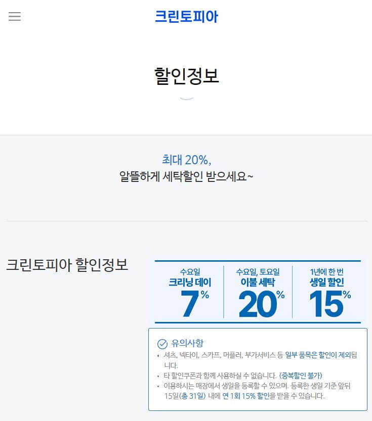 크린토피아는 고객들에게 더욱 경제적인 세탁 서비스를 제공하기 위해 다양한 할인 방법을 운영하고 있습니다.