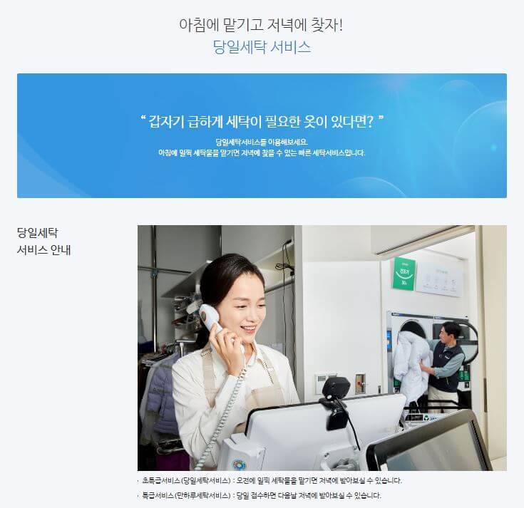 초특급 서비스(당일 세탁): 오전에 맡기면 저녁에 찾을 수 있습니다. 특급 서비스 (만 하루 세탁): 당일 접수하면 다음날 저녁에 찾을 수 있습니다.