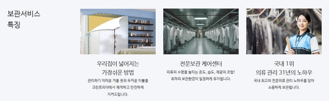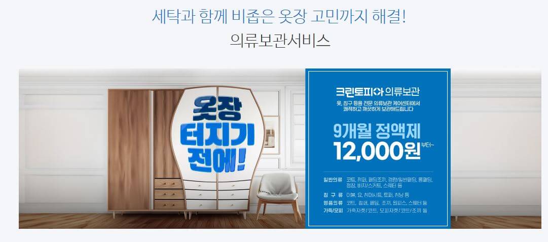 크린토피아는 계절이 지난 옷이나 침구를 세탁 후 전용 센터에서 보관했다가 필요할 때 배송해 주는 서비스도 제공합니다.
